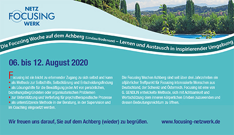 Focusing ist ein Zugang zu unserem noch nicht gewussten inneren Erleben. Die meisten Menschen kennen körperlich vage und unscharfe Empfindungen. Sie begleiten unser Erleben bei persönlich wichtigen Fragen und Problemen aber auch in alltäglichen Situationen. Im Focusing wenden wir uns dieser inneren Welt - für die wir noch keine Worte haben - in achtsamer und interessierter Weise zu. Indem wir den körperlich gespürten Ahnungen folgen, beginnt ein Verstehensprozess, der über das Gedachte und auch über die schon bekannten Gefühle hinausgeht. Wir finden neue stimmigere Perspektiven und eine bessere Verbindung zu uns selbst; die eigenen Freiheitsgrade werden erhöht. Das Grundlagenseminar ist für alle Interessierten offen, die Focusing kennen lernen oder frühere Erfahrungen auffrischen möchten – gleich ob persönlich oder beruflich motiviert. Ausgehend von eigenen kleinen Themen können Sie die Wirkweise des Focusing in sich erfahren. Im Zweiersetting können erste Schritte im Focusingbegleiten erkundet werden und kleine erlebensbezogene Theorieeinheiten schaffen zusätzlich ein grundlegendes Verständnis des Prozessgeschehens.